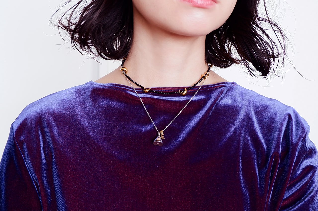 「クリームのような柔らかさのあるウェーブなシルエットと一癖何か小さな強さあるいは何か怪しげな雰囲気のあるもの」のシリーズからネックレスを制作させて頂きました。