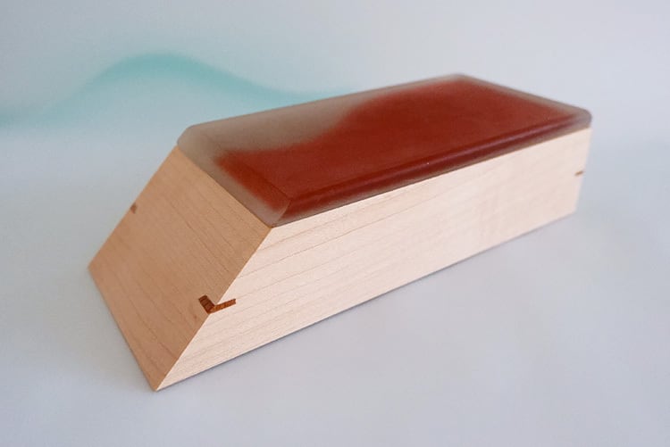 『木箱の部分は、伝統的な技法である<さしもの>の技法で家具などを製作されている<さしものかぐ たかはし>の職人の高橋さんに製作していただいており、高橋さんの製作されている家具同様に長く使って頂けるよう気候変動などによる木の伸び縮みをmm単位で、計算した丁寧なつくりになっております。』