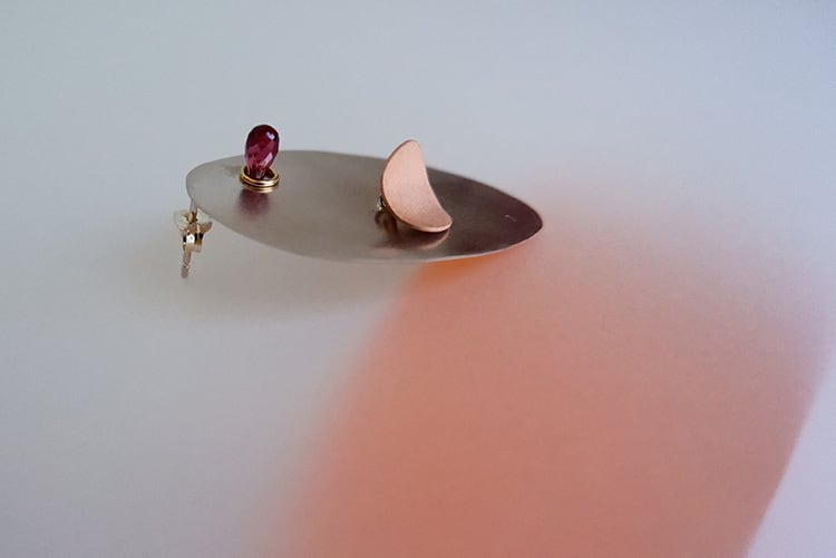 シルバーのプレートに小さな花びらのようなヌーディーカラーのパーツが一枚だけ揺れるようについたガーネットと18k輪っか付ピアスです。
