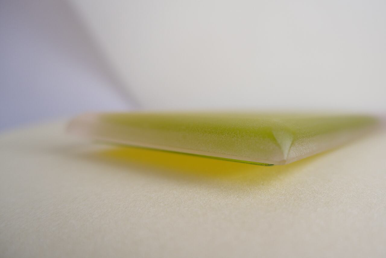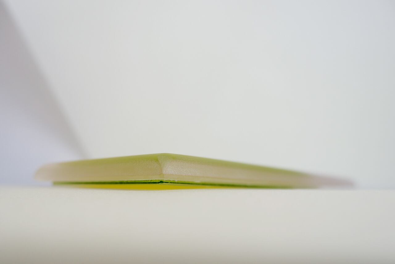 ピンクのガラス越しに見るとほんわかこの綺麗なキミドリが透けるところがデザイナーのお気に入りポイントです。