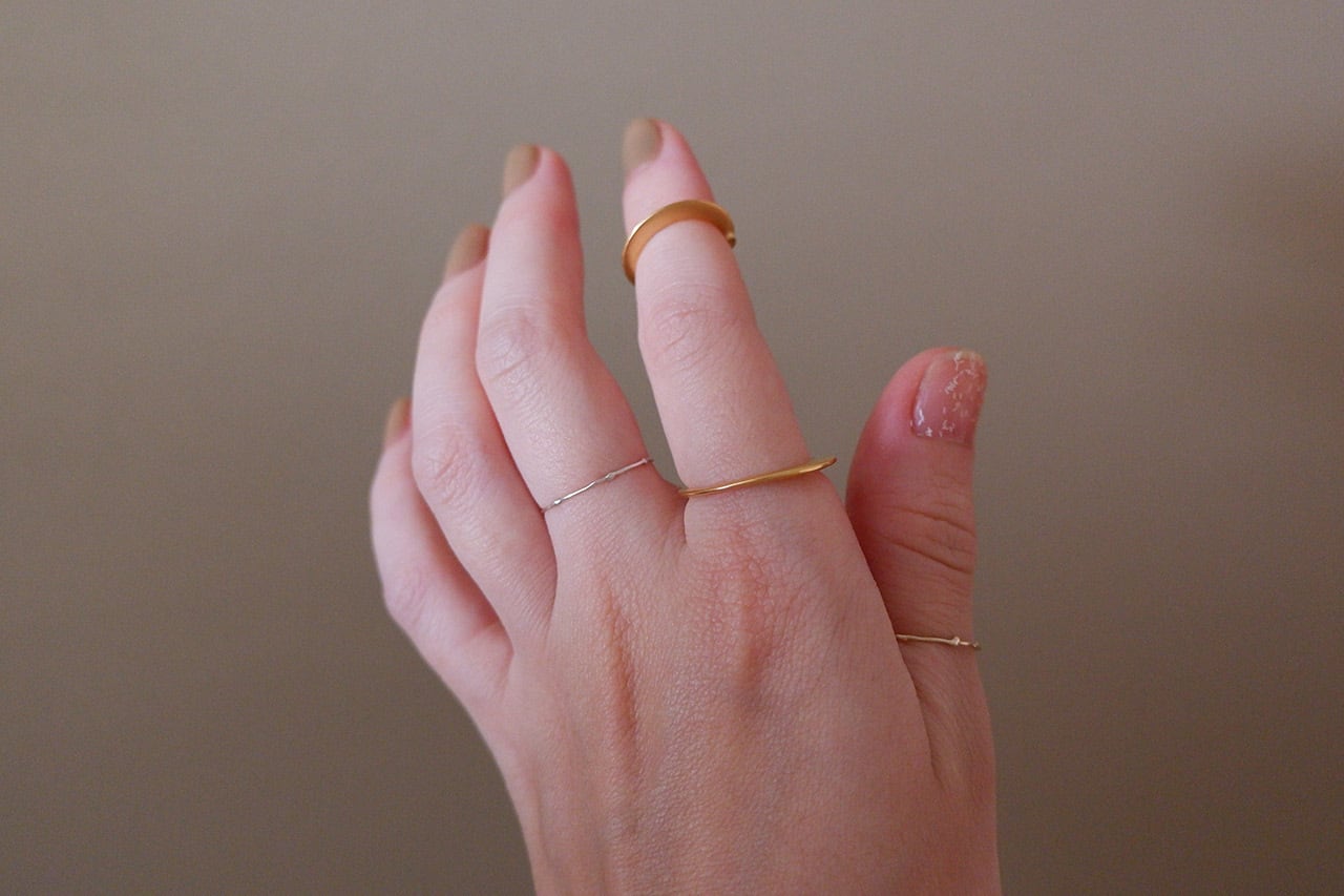 三日月型のシンプルな形ですがつける向きで見え方が変わりどんなリングとも合わせやすく、表と裏でマット加工と鏡面加工をしていてその日の気分でつけ方を色々お楽しみ頂けるコーディネートには欠かせないアイテムになりそうです。