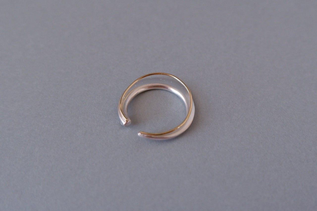 三日月型のシンプルな形のリングに繊細な18kイエローゴールドの線が重なったリングになります。