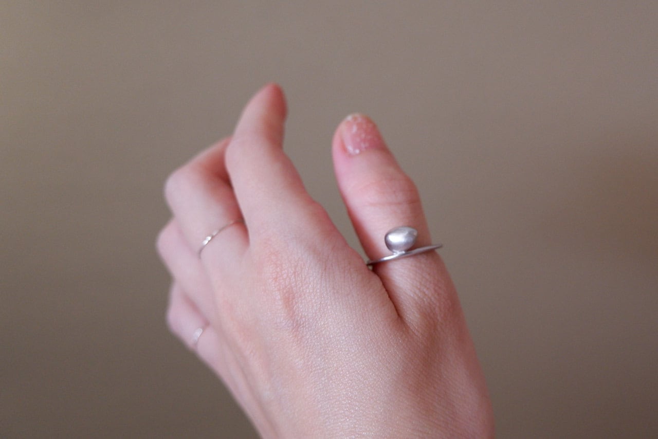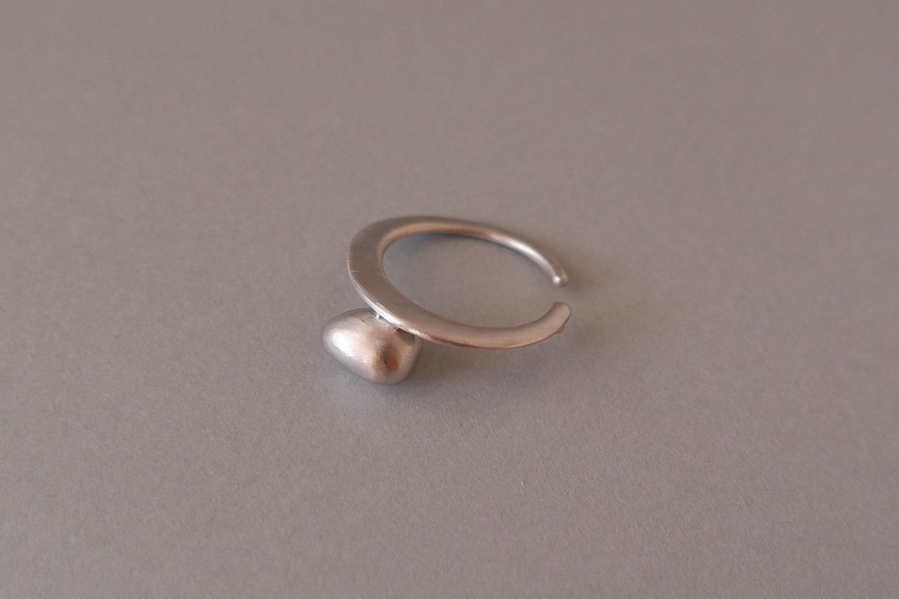 三日月型のシンプルな形のリングに絶妙な位置に卵型の球体をつけたデザインのリングです。