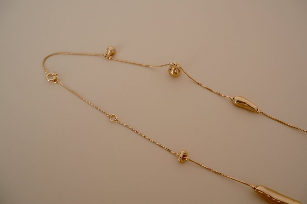 アーカイブアイテムのフルーツの曲線シリーズと有機的シルエットのシリーズを掛け合わせてデザインしました。形が違うぱらぱらと散らばったモチーフたちが首周りを華やかに彩ります。夏はTシャツ・冬はニットに合わせるだけで普段のコーディネイトがいつもより素敵になります。ネックレスの重ね付けにもおすすめなアイテムです。
